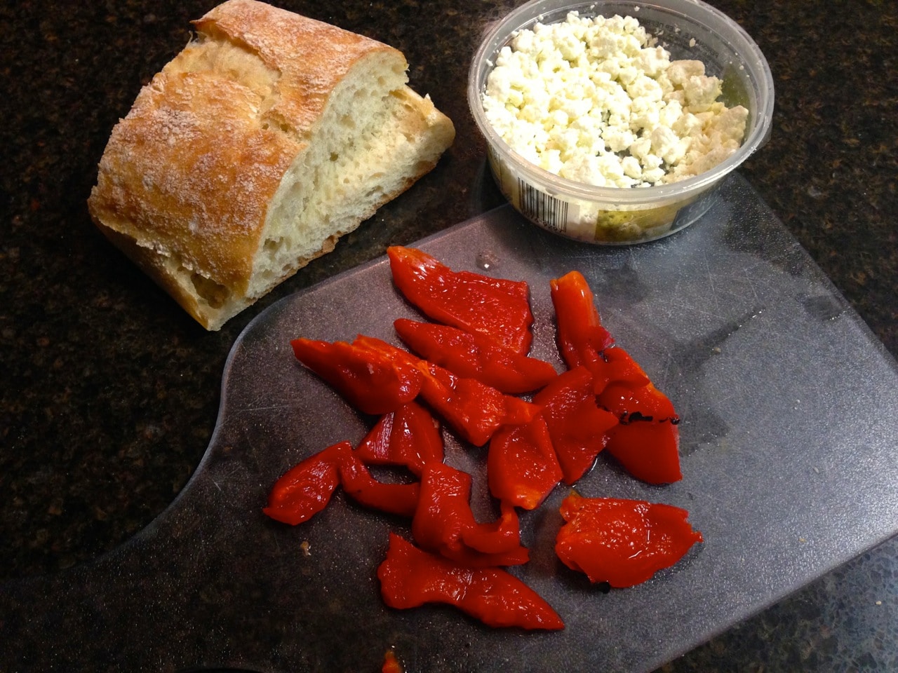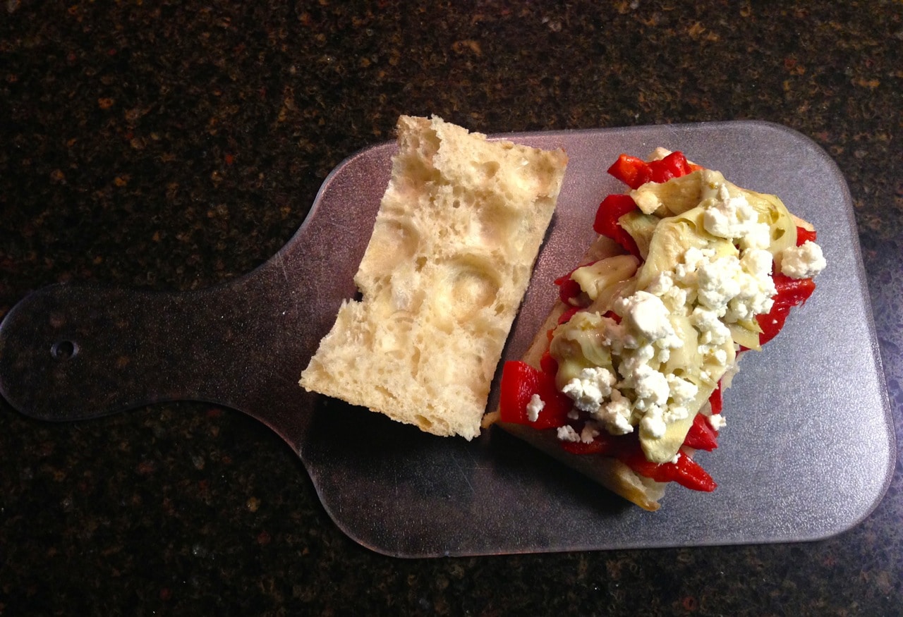 Cut the bread to the appropriate sandwich size and then layer on the ingredients. Roasted peppers lay pretty flat so you can start with them on the bottom. Then add the artichokes and top with goat cheese. I used goat cheese crumbles so it was hard to get it all balanced on there. It probably would have been easier to get a spreadable goat cheese and smear it on the bread.