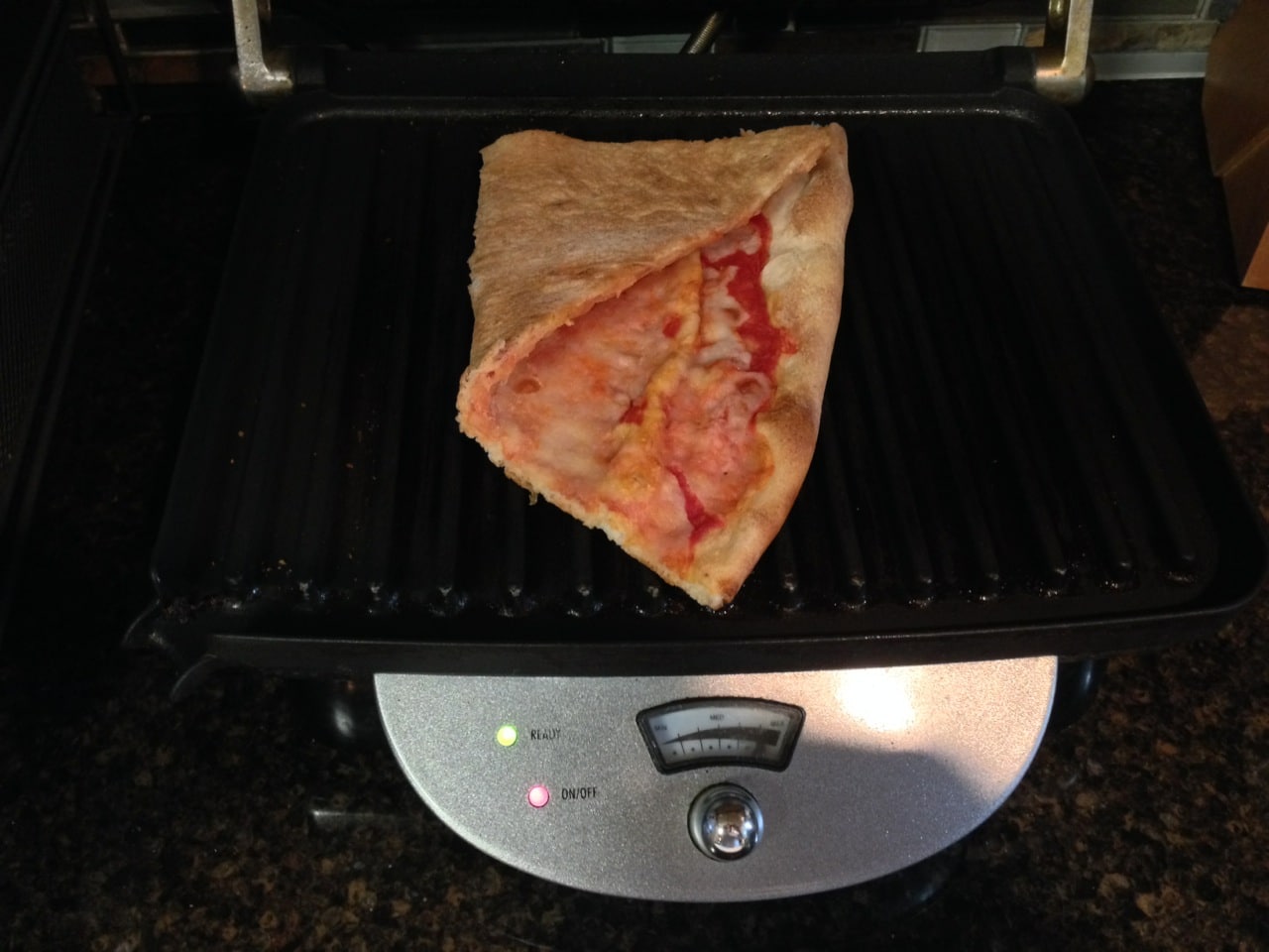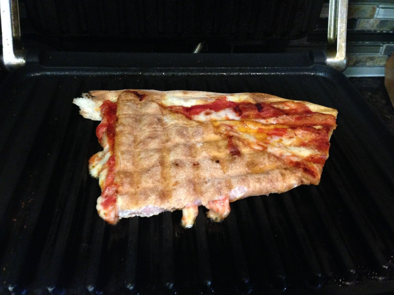 The best way to do it is to take two slices and place them on top of each other. Cheese side facing cheese side and crusts on the outside facing the panini press grill plates. 2-4 minutes later and you have a real pizza panini. The cheese and sauce are sealed inside two pizzeria quality crusts. Take a pizza wheel and slice them into strips and you can even dunk them into small bowl of pizza sauce. If you only have one slice, then fold the tip over the crust like I did in the pictures on this page. Panini pizza is just about as close as you’re going to get to reheating your leftover pizza to it’s original quality.