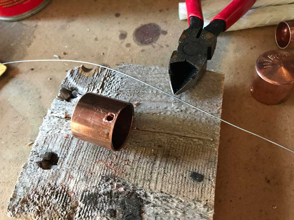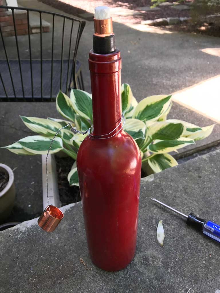 If you plan on leaving your wine bottle torches outside even when it rains then you’ll need some caps. Rain will soak through the wick and dilute the fuel until it eventually won’t light anymore. I drilled some small holes in plumbing end caps and ran a wire though it. The wire is so that I can connect the cap to the bottle and not worry about losing it. Wrap the wire around the bottle and leave enough slack so that you can easily take it on and off.