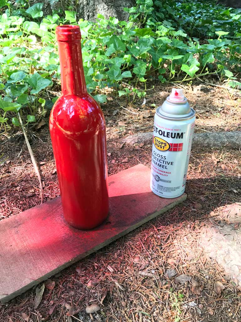 The first thing I did was paint two wine bottles red to match my patio umbrellas. Definitely not required but I took a guess that I’d like the way they looked. And I guessed right. The red is a nice pop of color and as I said before, they match the umbrellas.