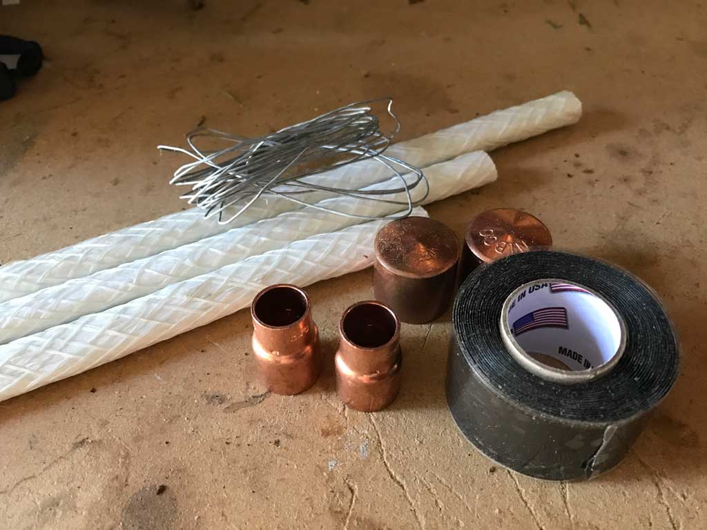 Now it was time to visit the plumbing department. I needed copper plumbing pieces and started searching through all the boxes for the right sized couplings. One end needs to fit inside the wine bottle and the other end should snuggly hold a torch wick. Depending on your bottle you might need a regular coupling but I needed a reduction coupling. The end that fits inside the wine bottle should not fit tightly. It needs to be smaller so that you can wrap it with silicon tape. This rubbery tape creates a seal so that you aren’t leaking citronella torch juice all over the patio. We’re not making molotov cocktails, we’re just trying to repel some bugs.