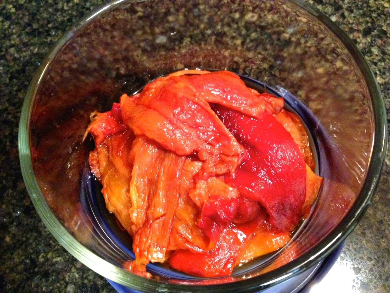 When you’re all finished, place the pepper pieces in a container and drizzle some olive oil in there. You can also put clove of garlic in there too for extra flavor.