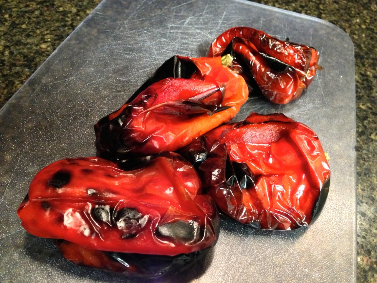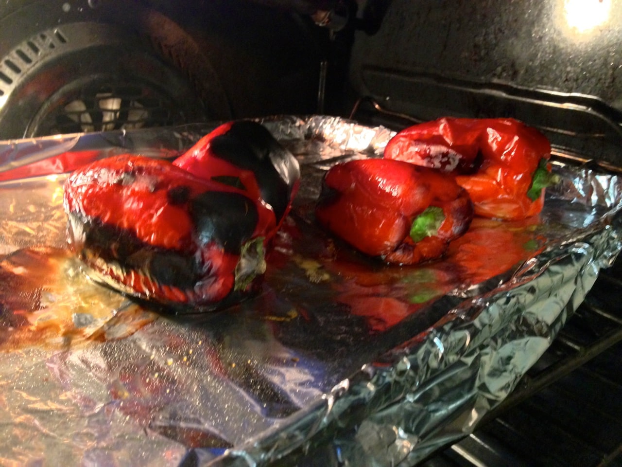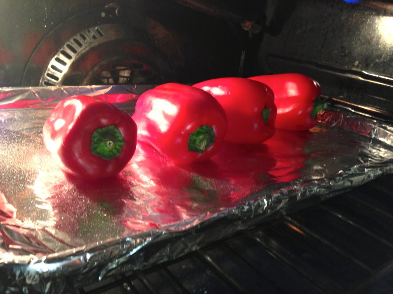 You can roast the peppers in your broiler or on your BBQ. You want a high flame and the idea is to char the skin until it’s black. Inside the pepper will get all steamy and soft. Depending on the heat of your grill it won’t take too long for the skin of the peppers to get black. Every few minutes rotate the peppers so that they char evenly. When you have a good char and the peppers are starting to feel a little soft, you want to remove them from the grill or broiler and then place them in a paper bag. The paper bag holds the moisture in there and helps the skins peel off. Let them sit in there for about 15 minutes or until cool enough to touch.