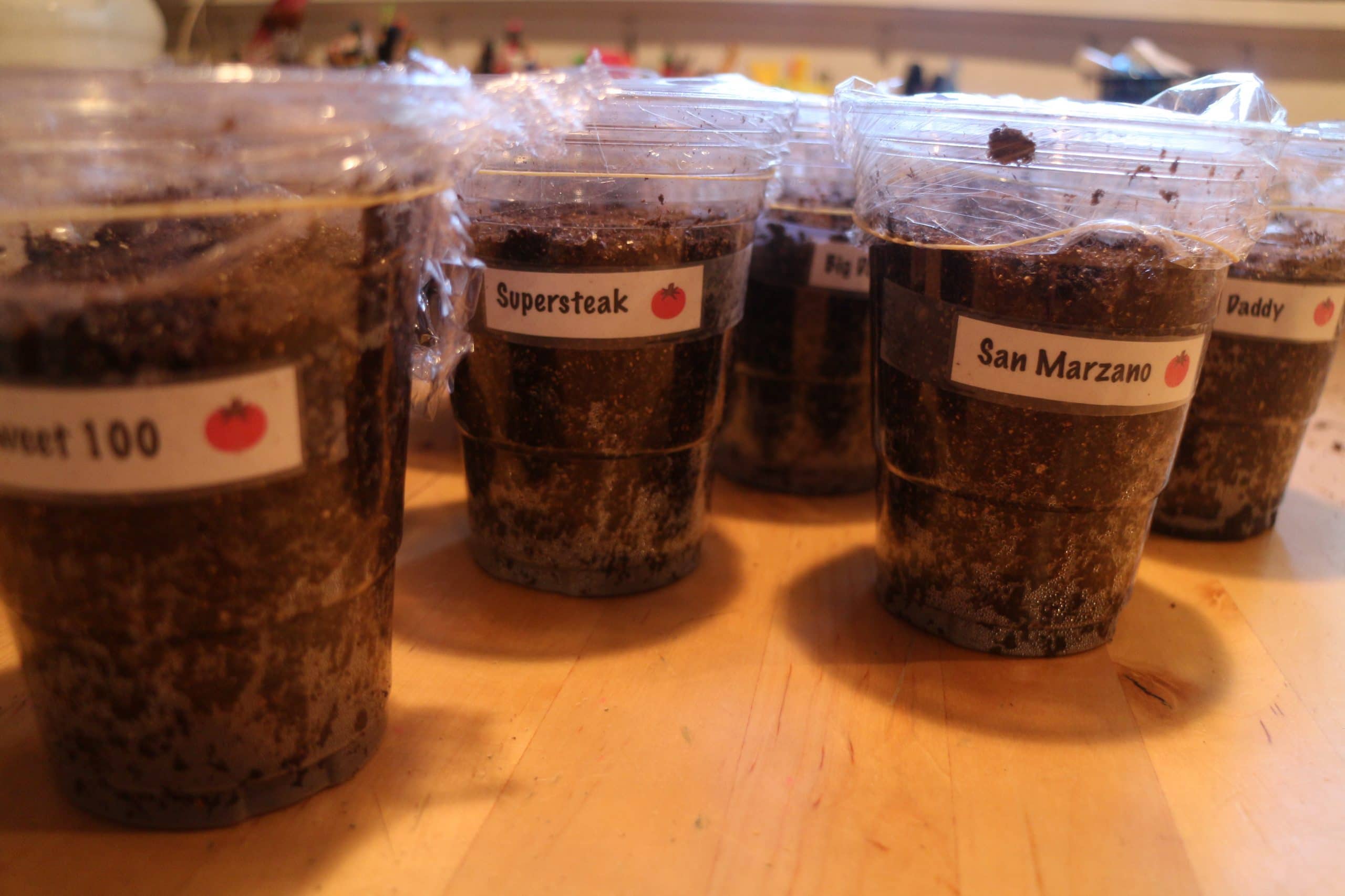 Next I get some plastic or paper cups and fill them with moist seed starting soil. I empty the package of soil into a container and add enough water to make mud balls that aren’t dripping all over the place. Too much water is just going to make a big mess. Gently press the damp soil into the cups and then plant the seeds. You should follow the instructions on the seed packet about planting depth. For most tomatoes it’s usually about 1/4” deep.
