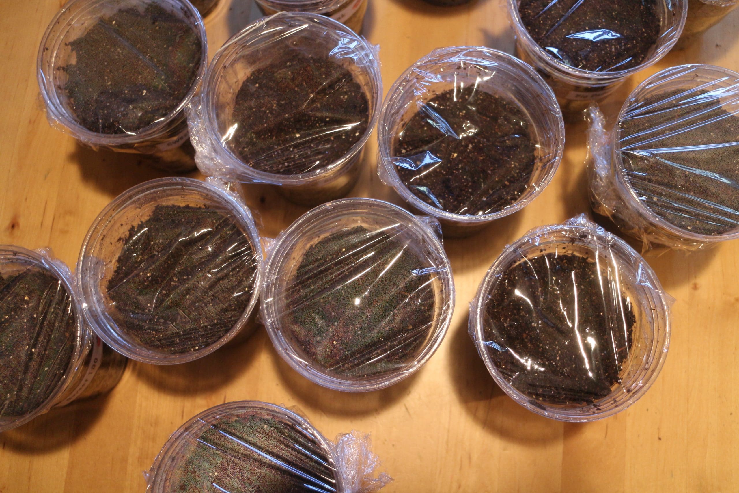 The most important thing to remember to get good germination is to keep the seeds moist. I take a piece of plastic wrap and cover the top of each cup to keep the moisture in. You can put a rubber band around the top of the cup to hold the plastic wrap on.