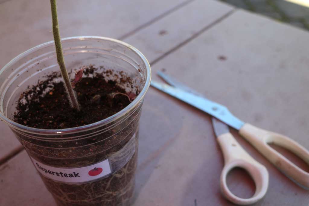 So once the seedlings sprout and start to grow you’re going to want to murder some of them. Survival of the fittest is my motto for thinning tomato seedlings. Keep the healthiest looking plant, growing well, not too spindly, good leaves and then cut the rest with a scissor. You don’t want to pull out the seedlings because that will disturb the roots of the plant that you are keeping. Just cut the extras with a scissor as close as dirt level as you can get and that will do it. The plant is just a baby and doesn’t have the strength to recover from such a drastic pruning.
